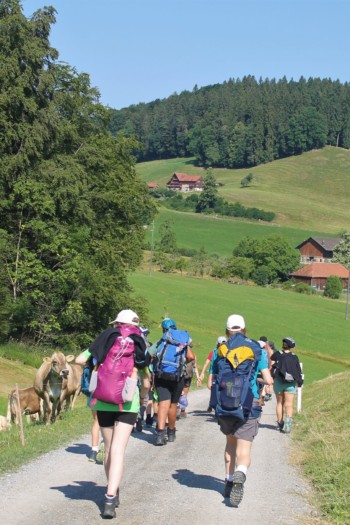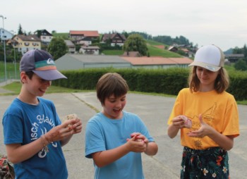 Heute Morgen starteten wir schon früh mit unserer Wanderung. Wir machten uns auf den Weg zum Berg Schwarzzahn, wo alle Hexen jeweils vor der Walpurgisnacht hinpilgern, um Glück, Kraft und Magie für dieses grosse Fest zu sammeln. Dies wollten wir natürlich auch tun, um für unsere eigene Walpurgisnacht vorbereitet zu sein. Auf dem Weg, der uns in brütender Hitze an einen Fluss, durch Wälder und über Wiesen führte, lernten die Junghexen auch Neues im Thema Kartenkunde.
