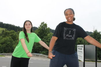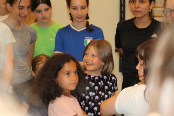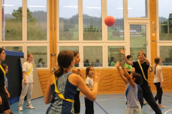 Für das Abendprogramm bekommen die Kids die Möglichkeit, sich nochmals richtig auszutoben: Es wird ein Burgball gespielt. Nach 15 Minuten haben beide Teams eine mehr oder weniger stabile Burg aufgebaut, und die Rollen werden verteilt. Schon bald ist die kleine Turnhalle erfüllt von motivierten Zurufen und Gelächter. Als entspannter Ausklang werden noch ein paar kleinere Spiele gespielt, zum Beispiel „Bombe“ oder „Chuehstallparty“. Als krönenden Abschluss gibt es Vanillepudding zum Dessert. An diesem Abend sind die Mädchen ziemlich erschöpft, und bald wird es leise in den Schlafräumen.