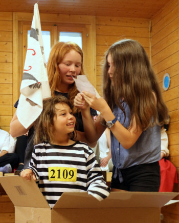 Kurz vor Mittag teilten uns unsere beiden Navigatoren – I-Da und I-Dort – ganz aufgeregt mit, dass auf der angesteuerten Insel unser Schatz vergraben sei! Die Vorfreude war gross. Allerdings konnten wir das Schiff nicht bis ganz an das Ufer steuern. Also mussten wir bei einem Geländespiel so viele kleine Seilstücke wie möglich sammeln, um diese schliesslich zu einem langen Seil verknüpfen und uns damit an Land ziehen zu können. Am späten Nachmittag setzten wir erstmals Fuss auf unsere Schatzinsel.