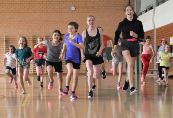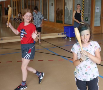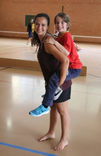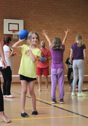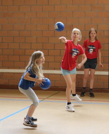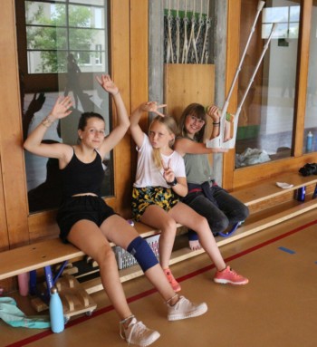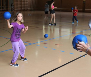 Am Nachmittag mussten wir aufgrund regnerischen Wetters kurzerhand umdisponieren und spielten in der Turnhalle diverse Arten von Völkerball und Sitzball. Die sportliche Aktivität wurde mit motivierender Musik untermalt, sodass die Stimmung top blieb und sogar die Sonne wieder hervorlocken konnte.