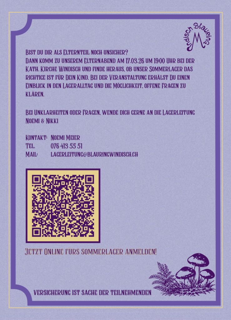 Bist du dir als Elternteil noch unsicher? Dann komm zu unserem Elternabend am 17.03.26 um 19:00 Uhr bei der Kath. Kirche Windisch und finde heraus, ob unser Sommerlager das richtige ist für Dein Kind. Bei der Veranstaltung erhälst Du einen Einblick in den Lageralltag und die Möglichkeit, offene Fragen zu klären.
